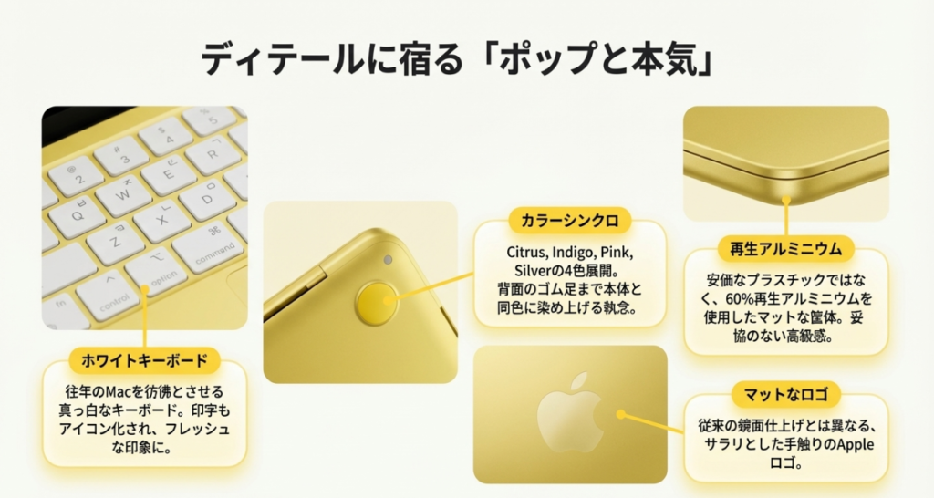 - デザインと質感が優れている: アルミボディを採用しており、安っぽさが全くないのがいいよね!丸みを帯びたポップなデザインで、キーボードや底面のゴムの色まで本体カラーと統一されている点が可愛らしいと評価できるね。