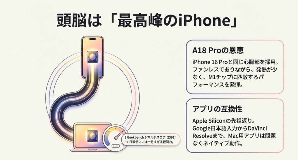 - 動画編集も条件次第で可能: 軽い4K動画のカットや書き出し程度であれば、意外にもこなすことができる。