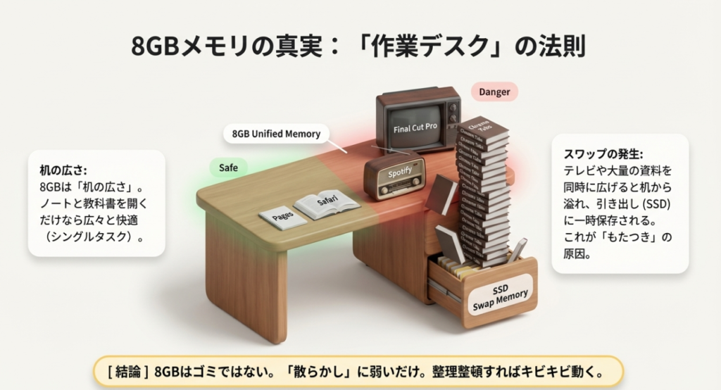 - マルチタスクに弱い: メモリが8GBに制限されているため、複数の重いアプリを同時に開いたり、ブラウザのタブを大量に開いたりすると、動作がもたついたりカクつくこともあるね。
