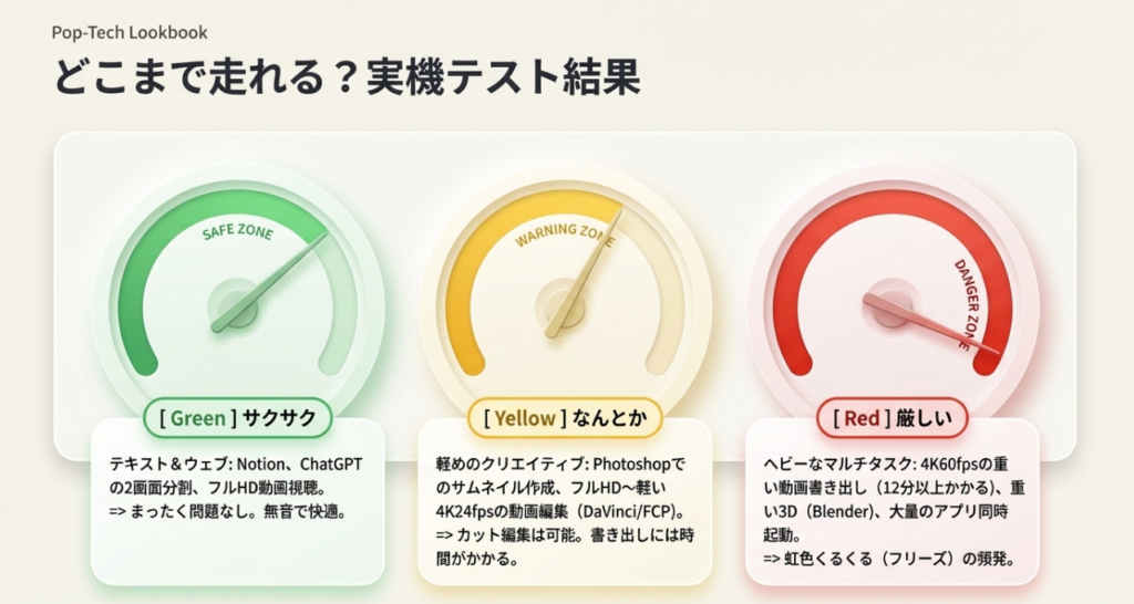 - 重い作業には不向き: 4K 60fpsの重い動画編集や、Blenderなどの3DCGソフト、レイヤーを多用する画像編集などは、フリーズしたり書き出しに非常に時間がかかったりすることもあるよ。
