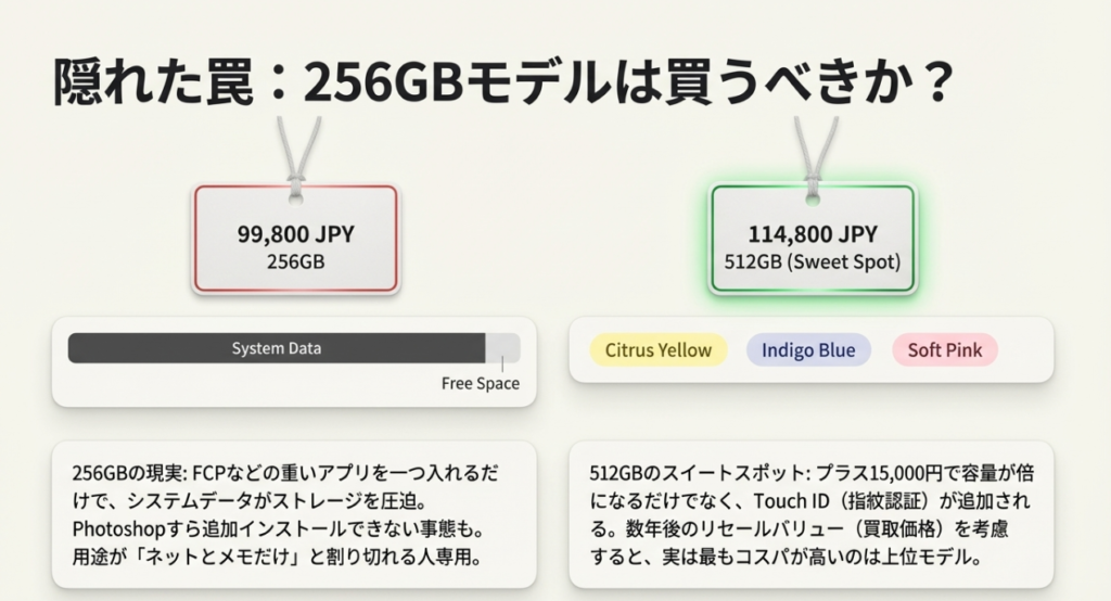 - 価格差と将来の買い取り価格(リセールバリュー) 256GBモデルと512GBモデルの価格差は約15,000円。この価格差でストレージが倍になり、さらにTouch IDも付くことを考えると、非常にコストパフォーマンスが高いと言えます。また、数年後に下取りや買い取りに出す際も、512GBモデルの方が高い値段が付きやすいため、最終的な実質負担額はお得になる可能性が高いと思うよ!