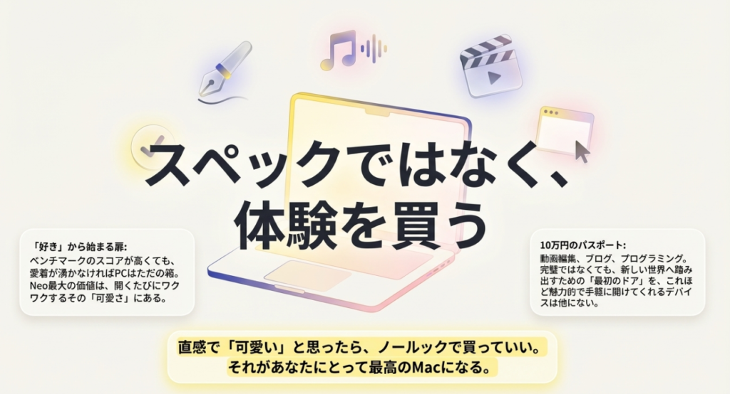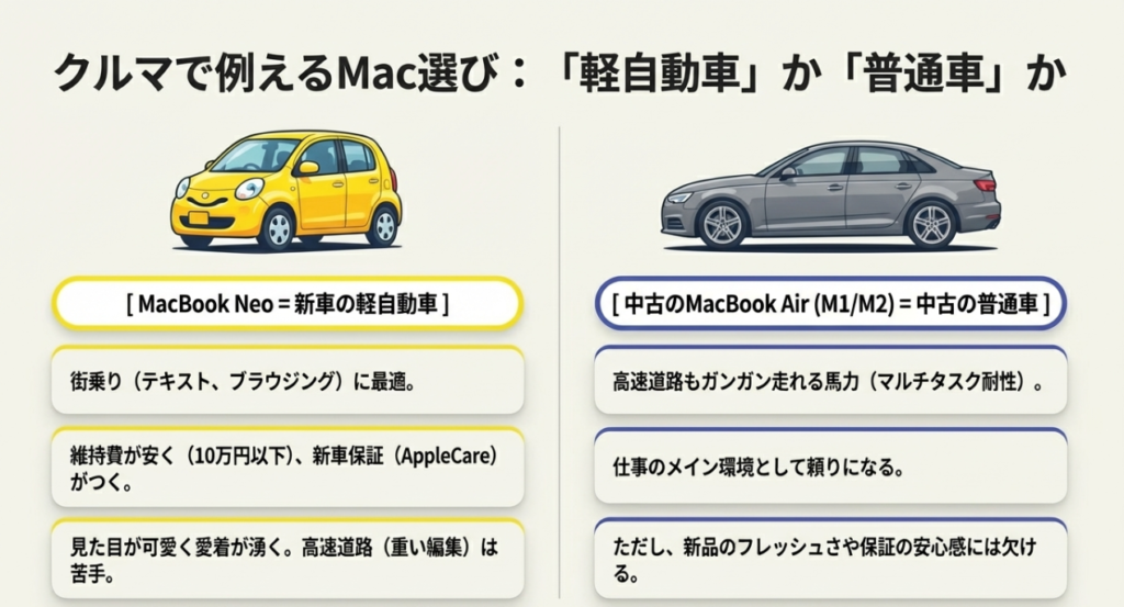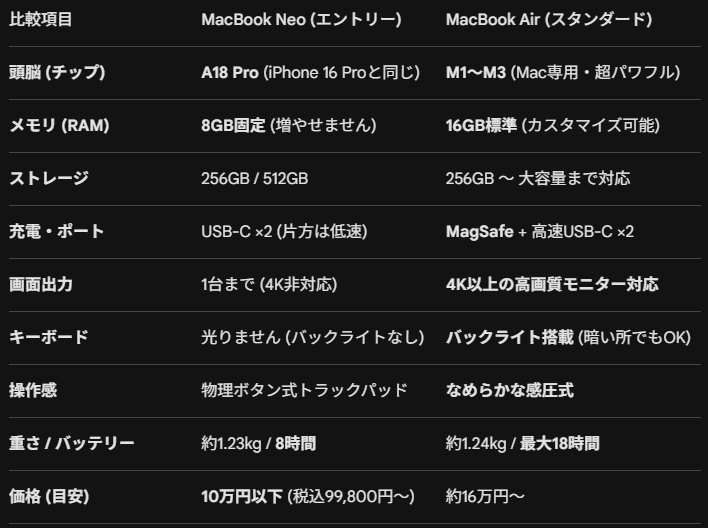 - 中古に抵抗がなく、コスパ(性能)を重視する人: メモリが16GB搭載されているM1チップのMacBook Air(中古)が、新品のNeoよりも安く買えるケースもあります。性能に対するコストパフォーマンスを追求するなら中古のAirが有利なところがあるね。