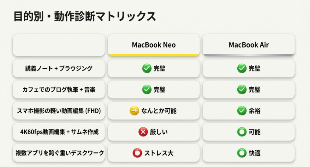 - 軽い作業(シングルタスク)がメインの人: レポート作成、動画視聴、Webブラウジングなどを単体で行うのであれば、Neoでも十分にサクサク快適に動作するから安心!